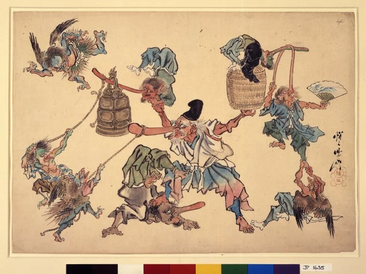 And I just picked up this book below, which has great pictures too. Including one of Winged Tengu acrobatics. Tengu, is usually translated goblin, but they are in fact the Japanese version of Chinese Thunder Gods. The Japanese version tend to have long noses instead of beaks. They are credited with having taught the Samurai swordsmanship. But these particular acrobats use their long very noses to do acrobatic tricks.